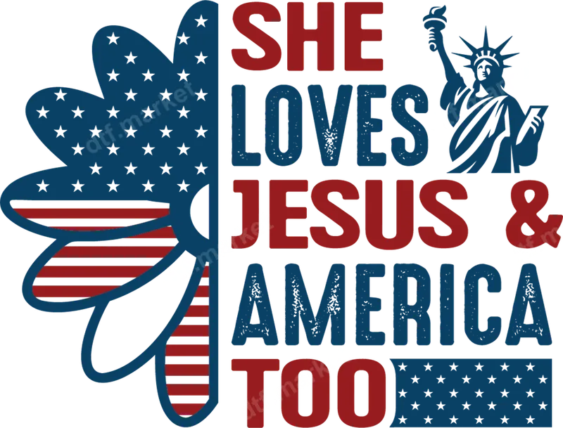 See allThis vibrant "She Loves Jesus & America Too" DTF transfer features a beautiful American flag sunflower alongside bold, distressed patriotic text and a subtle Statue of Liberty detail. This ready to press design combines faith, patriotism, and a feminine touch, making it a powerful statement piece. It's a high-quality direct to film transfer that brings your apparel to life with stunning colors and crisp detail. Perfect for patriotic women, Christian ladies, and anyone who proudly embraces their faith and love for the USA. This heat press design is ideal for Fourth of July celebrations, Memorial Day events, political rallies, church gatherings, or everyday wear. It makes a thoughtful gift for moms, grandmas, sisters, or friends who embody these values and want to showcase their beliefs. Our versatile heat press transfers are designed for easy application on a wide range of materials, including cotton, polyester, and various fabric blends. For best results, use a heat press at 300-325°F for 15 seconds with medium pressure. These iron on decals can also be applied with a household iron, making customization accessible for everyone. Enjoy a professional finish with no tedious weeding required. Experience superior quality with our durable t-shirt transfers, known for their vibrant colors that resist cracking and peeling even after multiple washes. The professional-grade DTF film ensures a soft hand feel once applied, providing maximum comfort. Each apparel transfer is crafted with a strong adhesive, ensuring a lasting bond to your garment for years of proud wear.