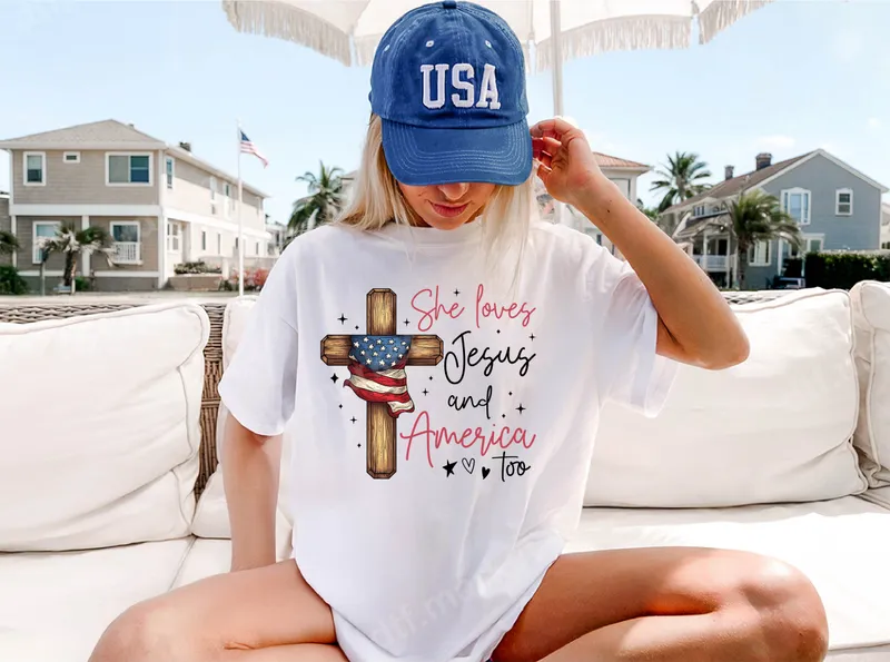 She Loves Jesus America Too DTF Transfer | Patriotic Faith Cross Design