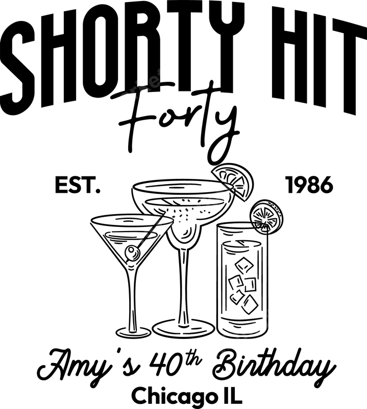 See allThis vibrant "Shorty Hit Forty" DTF transfer is the perfect design to celebrate a fabulous 40th birthday. Featuring elegant cocktail glasses – a martini, margarita, and a highball – alongside "EST. 1986" and customizable text for "Amy's 40th Birthday, Chicago IL," this ready to press transfer captures a sophisticated yet fun party vibe. It’s designed to add a personal touch to any garment, making it a standout piece for the birthday celebrant. This custom heat transfer is ideal for anyone celebrating their 40th birthday, especially those born in 1986. It's perfect for birthday parties, girls' trips, family gatherings, or as a unique gift for a friend turning forty. Easily create matching shirts for the entire birthday squad or a special personalized item for the guest of honor. It also makes a fantastic keepsake for a milestone occasion. Applying this ready to press transfer is a breeze, compatible with a wide range of fabrics including cotton, polyester, and their blends. For best results, use a heat press at 300-325°F for 15 seconds with medium pressure. It can also be applied with a household iron (follow included instructions for iron-on transfers). Unlike vinyl transfers, there's no weeding involved – simply press and peel for a professional finish. Experience superior quality with our professional-grade DTF transfer. Our direct to film transfers are known for their vibrant colors, exceptional durability, and soft-to-touch feel that won't crack or peel. Crafted with high-quality DTF film and strong adhesive, these apparel transfers ensure your custom designs look amazing and last through countless washes. Elevate your garments with a premium heat press design that truly stands out.
