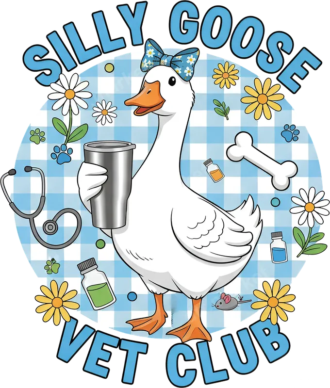 See allThis vibrant DTF transfer features an adorable white goose, sporting a daisy-adorned blue bow, confidently holding a metal tumbler. The design playfully declares "Silly Goose Vet Club" in charming blue letters, set against a cheerful blue and white gingham backdrop. Surrounding the charismatic goose are delightful veterinary-themed elements like a stethoscope, paw prints, a bone, and various medicine bottles, creating a whimsical and dedicated atmosphere perfect for animal care professionals. This eye-catching heat press design is fully ready to press, making it easy to create custom apparel. This unique ready to press transfer is a must-have for veterinarians, vet technicians, veterinary assistants, and anyone passionate about animal welfare. It's an ideal shirt design for vet clinic staff uniforms, student events, or casual wear to show off your love for animals. Perfect for graduation gifts for aspiring vets, appreciation gifts for your favorite vet tech, or a fun way to celebrate National Pet Day. Embrace your role with humor and heart, making it a fantastic conversation starter at work or among friends. Applying this versatile apparel transfer is straightforward, ensuring professional results on a wide range of fabrics including cotton, polyester, and their blends. For best adhesion, use a heat press at 300-325°F for 15 seconds with medium pressure, then peel cold. If a heat press isn't available, a household iron can also be used following similar instructions. Enjoy the convenience of a no-weeding transfer, saving you time and effort compared to traditional vinyl transfer methods. Our direct to film transfer offers exceptional quality, producing vibrant colors that stand out beautifully on any garment. The durable print is designed to be crack-resistant and soft to the touch, ensuring long-lasting wear and comfort. Crafted using professional-grade DTF film with a strong adhesive, this iron on decal will securely bond to your chosen fabric, maintaining its integrity wash after wash. Elevate your wardrobe with a durable and high-quality heat press transfer.