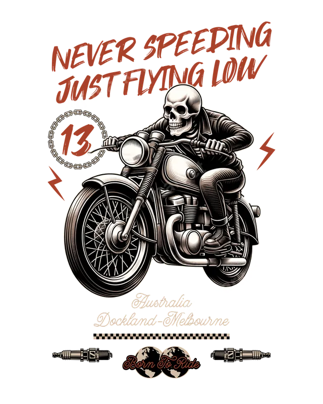 See allUnleash your inner rebel with this striking "Never Speeding Just Flying Low" DTF transfer, featuring a cool skeleton riding a classic vintage motorcycle. This detailed direct to film transfer captures the spirit of the open road, complete with "13" in a chain detail, spark plugs, and the motto "Born To Ride Australia Dockland-Melbourne." It's a high-quality, ready to press design perfect for anyone who loves the biker lifestyle and unique, edgy apparel. This motorcycle skeleton heat transfer is ideal for bikers, motorcycle club members, and anyone with a passion for vintage style and road trip adventures. It makes an excellent gift for Father's Day, birthdays, or as a treat for yourself to personalize jackets, vests, or t-shirts. Embrace the freedom of the road and showcase your unique style with this iconic iron on transfer. Applying your new heat press design is incredibly simple. This versatile transfer works beautifully on almost any fabric type, including cotton, polyester, and their blends. For best results, use a heat press at 300-325°F for 15 seconds with medium pressure, then cold peel. A household iron can also be used with careful application. Forget about tedious weeding; these t-shirt transfers are designed for quick and easy pressing. Crafted using premium DTF film, this transfer boasts vibrant colors, sharp details, and exceptional durability. The advanced ink technology ensures your design is crack-resistant, fade-resistant, and incredibly soft to the touch after pressing, providing a professional finish that lasts. Our apparel transfers feature strong adhesive properties for a secure bond, making them a long-lasting addition to your favorite garments and accessories.