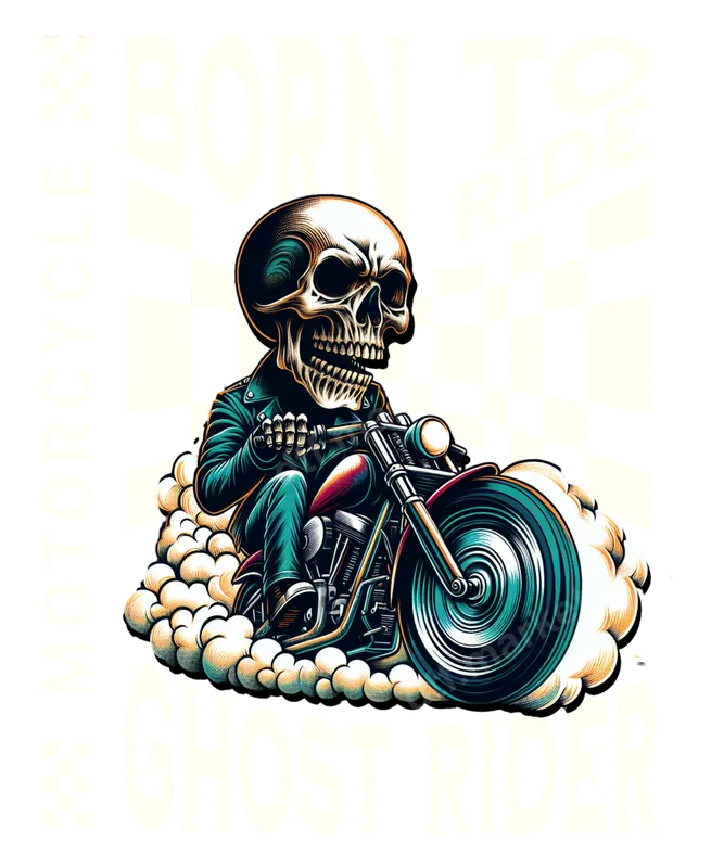 See allRev up your style with this dynamic 'Born To Ride' skeleton biker DTF transfer. This edgy design features a stylized skull confidently riding a classic motorcycle, kicking up a dramatic cloud of smoke against a subtle checkered flag background. Bold text declaring 'MOTORCYCLE' and 'GHOST RIDER' completes the powerful imagery, capturing the spirit of the open road and rebellious freedom. This high-quality direct to film transfer is ready to press, making custom apparel creation incredibly easy. Perfect for motorcycle enthusiasts, bikers, and anyone who loves a bit of edgy, rock 'n' roll style, this heat press design is ideal for personalizing clothing for rallies, bike week events, or everyday wear. It makes a fantastic gift for Father's Day, birthdays for a rider, or as a unique iron on decal for a friend who lives life in the fast lane. Show off your passion for two wheels and freedom with this striking apparel transfer. Applying this ready to press transfer is simple and efficient. It adheres beautifully to a wide range of materials, including cotton, polyester, and various fabric blends, ensuring versatility for your projects. For best results, use a heat press set between 300-325°F for 15 seconds with medium pressure, followed by a cool peel. No complicated weeding or layering like traditional vinyl transfer methods; just press and enjoy your professional-looking custom creation. Crafted using premium DTF film, this heat press ready transfer boasts incredibly vibrant colors and sharp details that truly pop on any garment. The design is engineered to be crack-resistant and durable, maintaining its integrity even after numerous washes. You'll appreciate the soft, flexible feel of the finished product, which integrates seamlessly into the fabric. Experience professional-grade results with this high-quality t-shirt transfer.