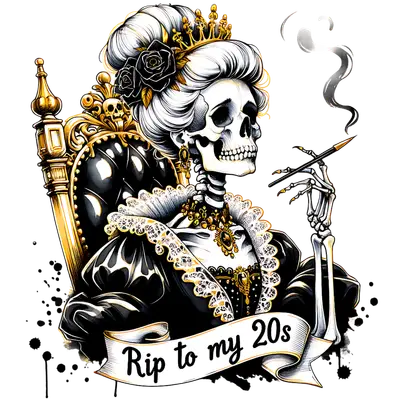 See allUnleash a darkly elegant sense of humor with our 'Rip to My 20s' DTF transfer. This striking design features a regal skeleton queen, adorned with a magnificent white powdered wig, a golden crown, black roses, and exquisite period jewelry. Seated grandly in a gilded throne, she casually holds a long cigarette holder, exuding an air of macabre sophistication. Below, a banner playfully declares 'Rip to my 20s,' making this the perfect ready to press design for celebrating a milestone birthday with a unique, vintage gothic flair. The intricate details and rich black, white, and gold palette create a truly captivating apparel transfer. This unique heat transfer design is perfect for those stepping into their 30s with a celebratory, yet slightly sarcastic, attitude. Ideal for 30th birthday parties, turning 30 gifts, or simply for anyone who appreciates dark humor and vintage gothic aesthetics. Crafters, Etsy sellers, and small boutique owners looking to offer distinctive custom apparel will find this iron on transfer a popular choice for t-shirts, hoodies, and bags. It's also a fantastic way for individuals to express their personality and mark a significant life transition with a touch of queenly undead charm. Applying this heat press transfer is effortless, transforming your garments in minutes. Our premium DTF transfers are compatible with a wide range of fabrics, including cotton, polyester, cotton-poly blends, and even nylon. For best results, use a heat press at 300-325°F for 15 seconds with medium pressure, or apply with a household iron following similar temperature guidelines. There's no tedious weeding required – just peel and press! Perfect for custom t-shirts, hoodies, sweatshirts, tote bags, pillow covers, and denim jackets. For lasting durability, wash garments inside out and tumble dry on low heat. Experience exceptional quality with every ready to press transfer from dtf.market. This direct to film transfer boasts vibrant, full-color printing with incredibly fine detail, ensuring your design stands out. Our transfers are crack-resistant and offer a soft hand feel, unlike heavy vinyl, which means ultimate comfort and durability. Each transfer is meticulously printed on premium DTF film with a strong adhesive backing, guaranteeing professional results and a seamless application experience that will impress both wearers and customers alike.