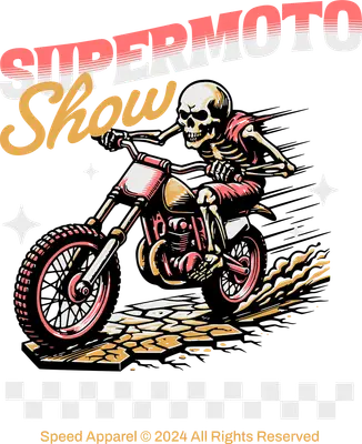 Rev up your style with this dynamic skeleton supermoto DTF transfer. The design features a skeletal rider fiercely gripping the handlebars of a dirt bike, kicking up dust and speed lines, with the bold text "SUPERMOTO Show" above. Rendered in a cool, vintage-inspired palette of muted reds, gold, and off-white, this ready to press design perfectly captures the thrill and edgy spirit of motorsports and custom bike culture. This an iron on transfer is perfect for supermoto enthusiasts, dirt bike racers, motorcycle club members, and anyone who loves a bit of rebellious, vintage-inspired streetwear. It's an excellent choice for motorcycle rallies, racing events, or as a unique gift for a biker friend. Small t-shirt businesses and Etsy crafters will find this heat transfer design an eye-catching addition to their apparel lines, appealing to a niche but passionate audience. Applying this heat press transfer is simple and efficient. It adheres flawlessly to a wide range of fabrics including cotton, polyester, cotton-poly blends, and even nylon. Achieve professional results using a heat press (recommended: 300-325°F for 15 seconds, medium pressure) or a household iron. There's no tedious weeding required—just peel, press, and admire! It's perfect for custom t-shirts, hoodies, sweatshirts, tote bags, pillow covers, and denim jackets. For long-lasting vibrancy, wash garments inside out and tumble dry low. Experience superior quality with this ready to press transfer, boasting vibrant, full-color printing and exceptional fine detail that truly pops. It's crack-resistant and remarkably soft to the touch, avoiding the heavy, stiff feel of traditional vinyl. Each direct to film transfer is meticulously printed on premium DTF film with a strong, reliable adhesive backing, ensuring a durable and professional finish every time you press.