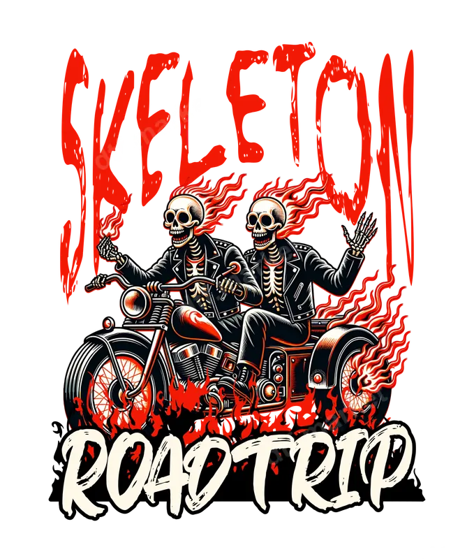See allUnleash your inner rebel with our 'Skeleton Roadtrip' DTF transfer! This electrifying design showcases two flaming skeletons, decked out in biker jackets, cruising confidently on a vintage motorcycle. Fiery red flames erupt from their skulls and the bike's wheels, creating a dynamic, edgy visual statement. The bold "SKELETON ROADTRIP" text in distressed red and cream font makes it a truly unique ready to press design for any garment. Perfect for motorcycle enthusiasts, rock and roll fans, or anyone who loves a rebellious aesthetic. This versatile heat transfer is ideal for adding a personalized touch to your wardrobe for biker rallies, concerts, Halloween, or everyday wear. It makes an awesome gift for friends and family who appreciate unique graphic apparel or a cool shirt design. Our premium DTF transfers are incredibly easy to apply, compatible with cotton, polyester, and most fabric blends. For best results, use a heat press at 300-325°F for 15 seconds with medium pressure, then peel cold. You can also achieve great results with a household iron. Enjoy a seamless application process with this ready to press transfer – no weeding or layering required, unlike traditional vinyl transfers. Experience professional-grade quality with vibrant colors that pop and a soft-to-touch finish that feels like part of the fabric. Each direct to film transfer is printed using high-quality inks on durable film with strong adhesive, ensuring your design is crack-resistant, fade-resistant, and built to last through countless washes. Elevate your apparel with a striking iron on decal that truly makes an impact.