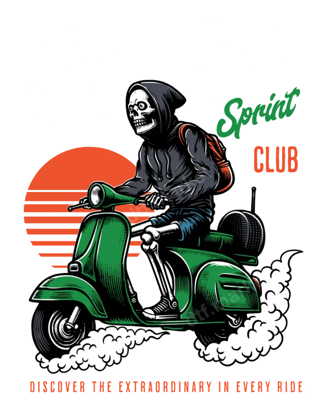 See allThis edgy DTF transfer showcases a cool skeleton in a hoodie and shorts, cruising on a classic green scooter. With a vintage sunset backdrop and "Sprint CLUB" lettering, the design captures an adventurous, retro-modern spirit. "DISCOVER THE EXTRAORDINARY IN EVERY RIDE" encourages exploration. This high-quality heat transfer is ready to press, ideal for personalizing apparel. Perfect for motorcycle enthusiasts, scooter clubs, and streetwear fans, this design blends retro charm with a bold, gothic edge. It's an excellent iron on transfer for custom apparel, suitable for bike rallies, music festivals, or casual wear. A unique gift for graphic tee lovers or small businesses creating distinctive merchandise. Our DTF transfers are versatile, applying seamlessly to cotton, polyester, and blends. Use a heat press at 300-325°F for 15 seconds with medium pressure, then cold peel. A household iron works too. Enjoy a ready to press transfer with no weeding, cutting, or layering—just press and peel for a professional finish. Expect exceptional quality with our direct to film transfers. Designs feature vibrant colors and sharp details, engineered to be crack-resistant and durable through countless washes. The special DTF film ensures a soft, flexible feel for ultimate comfort. Our professional-grade DTF transfers use a strong adhesive for a lasting bond, ensuring your custom shirt design looks fantastic for years.
