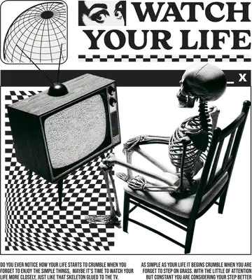 The design features a stark, black-and-white image of a skeleton slouched in a chair, mesmerized by the static on an old-school television set. Above, bold text declares "WATCH YOUR LIFE" accompanied by a pair of intense eyes and abstract grid elements, all set against a disorienting checkered pattern. This unique DTF transfer evokes a powerful message about screen addiction, existential thought, and the passage of time, with a distinct retro-futuristic or Y2K aesthetic. It's a ready to press design that combines a vintage look with a profound contemporary critique. This impactful design is perfect for those who appreciate thought-provoking art, dark humor, or a touch of existential commentary in their apparel. Ideal for streetwear enthusiasts, retro lovers, indie boutique owners, or individuals looking to make a statement at concerts, art shows, or casual gatherings. It’s also a unique iron on transfer for crafters and small businesses creating custom t-shirts, offering a design that sparks conversation and reflection. Applying this high-quality heat press transfer is simple and efficient. It adheres beautifully to a wide range of fabrics including cotton, polyester, cotton-poly blends, and even nylon. For best results, use a heat press at 300-325°F for 15 seconds with medium pressure, or follow instructions for a household iron. Forget the hassle of weeding; this iron on decal is ready to press right out of the package. Transform custom t-shirts, hoodies, sweatshirts, tote bags, and denim jackets. For long-lasting vibrancy, wash garments inside out and tumble dry low. This ready to press transfer delivers vibrant, full-color printing with exceptional detail, capturing every nuance of the original artwork. Our direct to film transfer technology ensures a crack-resistant finish that feels soft to the touch, avoiding the heavy, stiff feel often associated with vinyl transfers. Each apparel transfer is meticulously printed on premium DTF film, featuring a strong adhesive backing for professional, durable results that stand the test of time and wear.