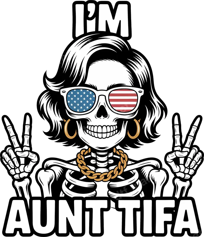 See allThis eye-catching DTF transfer features a stylish skeleton character rocking a fabulous wig, trendy hoop earrings, a chunky gold chain, and iconic sunglasses with a patriotic American flag design. The skeleton confidently flashes two peace signs, accompanied by the bold, humorous statement "I'M AUNT TIFA". This ready to press design blends edgy humor with Americana, making it a unique apparel transfer and conversation starter. This heat press ready transfer is ideal for anyone who loves a good pun, enjoys satirical humor, or wants to express a bold, independent spirit. It’s perfect for casual wear, social gatherings, or as a humorous gift for friends and family with a strong sense of individuality. Whether making a statement or just sharing a laugh, this design resonates with those who appreciate edgy fashion and witty wordplay. Applying this versatile iron on transfer is simple and hassle-free, designed for both beginners and experienced crafters. Our high-quality direct to film transfer adheres beautifully to a wide range of fabrics, including cotton, polyester, and various blends. For best results, use a heat press at 300-325°F for 15 seconds with medium pressure. A household iron can also be used following specific instructions. The best part? There’s absolutely no weeding required, saving you time and effort. Experience superior quality with this professional-grade t-shirt transfer. Our DTF transfers are renowned for their vibrant colors that truly pop, exceptional durability, and resistance to cracking or peeling, ensuring your design looks fantastic wash after wash. The finished heat transfer boasts a soft-to-touch feel, integrating seamlessly with your garment for maximum comfort. Each design is printed on premium DTF film with strong adhesive, guaranteeing a long-lasting, professional finish.