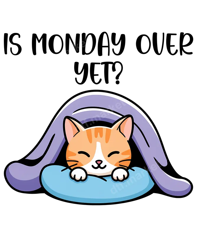 See allThis charming DTF transfer features an irresistibly cute orange tabby cat snuggled comfortably under a purple blanket, resting its head on a light blue pillow. Above this cozy scene, the playful question "IS MONDAY OVER YET?" is displayed in a friendly, handwritten-style font. This ready to press design perfectly captures that universal feeling of Monday morning dread, combining adorable pet imagery with relatable humor. It's an instant mood-lifter for anyone wishing the weekend lasted longer. This funny heat transfer is ideal for cat enthusiasts, weary workers, or students who appreciate Monday humor. It makes a fantastic gift for friends, family, or coworkers. Perfect for casual wear, office humor days, or expressing your true feelings from home. Apply this delightful iron on transfer to your favorite loungewear to make tough Mondays a little more bearable. Applying this custom transfer is incredibly simple. Our DTF transfers work beautifully on cotton, polyester, and blends. For best results, use a heat press at 300-325°F for 15 seconds with medium pressure, then peel cold. You can also achieve great results with a household iron. Best of all? No weeding required, saving you time and effort. Experience superior quality with this professional-grade direct to film transfer. Each design boasts vibrant colors, exceptional detail, and a soft, smooth feel once applied. Our premium DTF film ensures crack-resistant durability and long-lasting wear, even after multiple washes. This apparel transfer is made with strong adhesive, bonding securely to your garment for a high-quality finish.