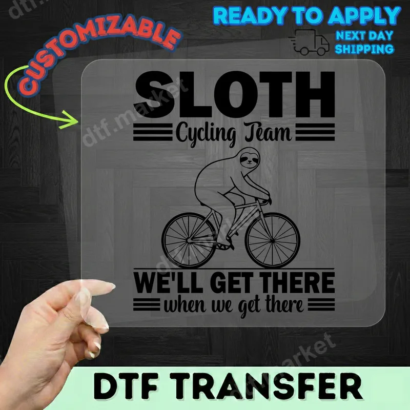 See allGet ready to embrace the journey, however slow, with our hilarious "Sloth Cycling Team - We'll Get There When We Get There" DTF transfer. This unique design features a cool sloth casually riding a bicycle, perfectly capturing a laid-back and humorous approach to life and cycling. It's a high-quality, ready to press direct to film transfer that brings a smile to anyone's face, making it an instant favorite for custom apparel projects. This funny iron on transfer is ideal for anyone who appreciates a good laugh, loves sloths, or enjoys cycling at their own pace. It makes a fantastic gift for friends, family, or even yourself, for birthdays, casual gatherings, or just to brighten someone's day. Perfect for recreational cyclists, sloth enthusiasts, or anyone with a chill attitude, this heat press design adds a touch of quirky charm to any garment. Applying this versatile heat transfer is quick and easy. Simply use a heat press at 300-325°F for 15 seconds with medium pressure, or even a household iron for smaller applications. Our DTF transfers are designed to work seamlessly on a wide range of fabrics, including cotton, polyester, and their blends, ensuring crisp results every time. No weeding is required, making your customization process incredibly efficient. Crafted with premium film, this apparel transfer delivers vibrant, crack-resistant graphics that feel soft to the touch and stand up to countless washes. The strong adhesive ensures a professional, long-lasting finish that won't peel or fade easily. Choose this exceptional heat press ready design for durable, eye-catching results that reflect your unique style and sense of humor.