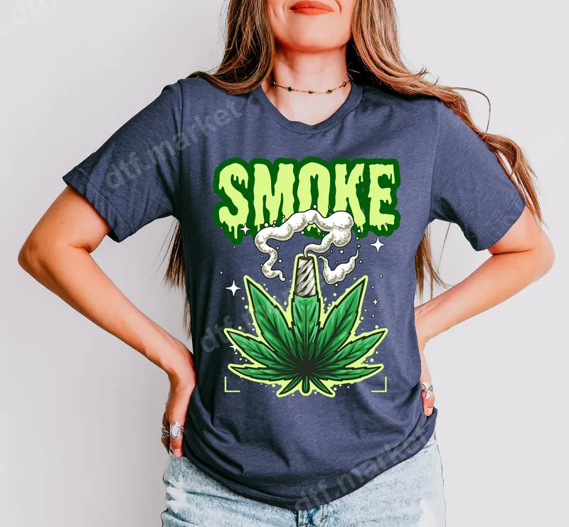See allThis vibrant DTF transfer features a striking cannabis leaf design with a lit joint and bold, drippy green 'SMOKE' text above it. The glowing outline and star accents give it an energetic, eye-catching vibe, perfect for making a statement. This high-quality, ready to press heat transfer is designed to bring a touch of edgy personality to any garment or accessory. Ideal for cannabis culture enthusiasts, 420 celebrations, or anyone who appreciates a laid-back, street-style aesthetic. This unique iron on decal makes a fantastic gift for friends who love distinctive graphic tees, or for personalizing your own wardrobe for festivals, concerts, or casual everyday wear. It’s a perfect way to express your personality with a bold graphic. Our premium DTF transfers are incredibly versatile, adhering beautifully to a wide range of materials including cotton, polyester, and their blends. Application is a breeze with a heat press: simply apply at 300-325°F for 15 seconds with medium pressure. No more tedious weeding like with traditional vinyl transfer designs! For household iron users, detailed instructions are provided for a successful application. Experience superior print quality with incredibly vibrant colors that pop and sharp details that last. Our direct to film transfers are engineered to be crack-resistant, peel-resistant, and soft to the touch, ensuring maximum comfort and durability wash after wash. Each heat press design is printed on professional-grade DTF film with a strong adhesive, guaranteeing a long-lasting, professional finish on all your customized apparel.