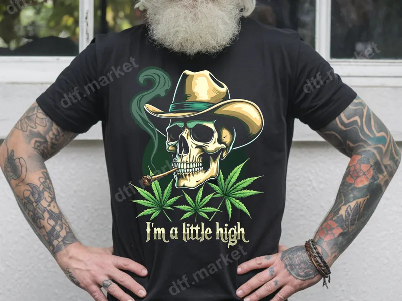 Smoking Cowboy Skull DTF Transfer - "I'm A Little High" Cannabis Design