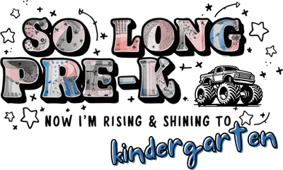 Celebrate a huge academic milestone with this vibrant "So Long Pre-K" DTF transfer. This playful design features the phrase "SO LONG PRE-K" in eye-catching, textured letters with distressed denim and soft watercolor-like patterns in blues, pinks, and grays. Below, the message "NOW I'M RISING & SHINING TO" leads to a bold, blue "kindergarten" in a cheerful script. A cool black and white monster truck graphic adds a touch of rugged fun, all accented by whimsical stars and doodles, making it a perfect ready to press design for any young graduate. This celebratory iron on transfer is ideal for parents, grandparents, and teachers looking to commemorate a child's big step from Pre-K to Kindergarten. It's a fantastic heat transfer design for end-of-year parties, graduation ceremonies, or as a special gift to mark their achievement. Small t-shirt businesses and crafters will find this a popular choice for custom apparel during back-to-school season or milestone celebrations. Applying this heat press transfer is simple and delivers professional results. It adheres beautifully to a wide range of materials including cotton, polyester, cotton-poly blends, and even nylon. Use a heat press at 300-325°F for 15 seconds with medium pressure, or apply with a household iron. There's no tedious weeding required—just peel and press! Perfect for creating custom t-shirts, hoodies, sweatshirts, tote bags, pillow covers, baby onesies, and denim jackets. For lasting durability, wash garments inside out and tumble dry low. Experience exceptional quality with this ready to press transfer. It boasts vibrant, full-color printing with crisp details and smooth gradients. The design is crack-resistant, feels soft to the touch, and avoids the heavy, stiff feel of traditional vinyl. Each direct to film transfer is printed on premium DTF film with a strong adhesive backing, ensuring a flawless application and professional finish every time.