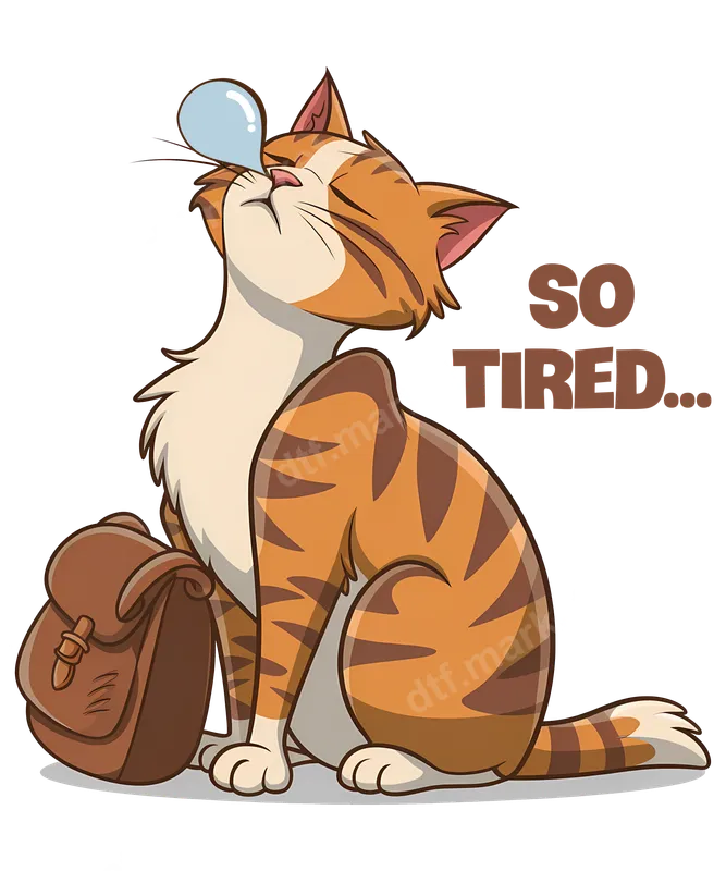 See allCapture the universal feeling of exhaustion with this adorable 'So Tired' cat DTF transfer. This charming design features a sleepy orange and white tabby cat, complete with a tiny snot bubble and a brown backpack, conveying ultimate weariness. The bold 'SO TIRED...' text perfectly complements the feline's expression, making this a relatable and humorous ready to press transfer for anyone feeling the drain of a long day or busy schedule. This unique design is ideal for cat enthusiasts, overworked students, busy parents, or anyone who appreciates a good laugh about life's daily grind. It makes a fantastic custom transfer for back-to-school season, college life, or just as a thoughtful gift for a friend who needs a pick-me-up (or a nap). Create personalized apparel that speaks volumes about your mood, whether for casual wear or funny event outfits. Our DTF transfers are incredibly versatile and can be applied seamlessly to a wide range of fabrics, including cotton, polyester, and various blends. For best results, use a heat press at 300-325°F for 15 seconds with medium pressure, then cold peel the film. A household iron can also be used with care. Enjoy the convenience of a heat press design with no complex weeding or layering required, making DIY projects a breeze. Experience superior quality with our professional-grade direct to film transfer. Each heat transfer boasts vibrant colors, excellent wash durability, and a soft-to-touch finish that won't crack or peel. Our premium DTF film ensures strong adhesion and a long-lasting print, transforming your t-shirts, hoodies, tote bags, or any apparel item into a statement piece. Get ready to press with confidence and wear your sleepy vibes proudly!