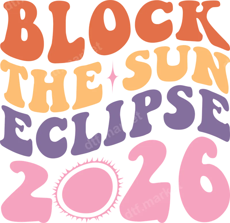 See allThis "BLOCK THE SUN ECLIPSE 2026" DTF transfer features a vibrant, groovy, retro bubble font with wavy letters. A palette of warm oranges, soft peaches, lavender, and pinks makes it eye-catching. A sparkling star and a stylized sun graphic replacing the '0' in 2026 commemorate the celestial event. This ready to press design offers a unique, vintage-inspired flair, perfect for the upcoming solar eclipse. This direct to film transfer is ideal for anyone excited about the 2026 solar eclipse. Create custom apparel for viewing parties, educational events, or as a memorable souvenir. Gift this unique heat press design to friends, family, or fellow eclipse chasers to celebrate. It's also great for science clubs, school events, or simply showing your love for space and retro style. Our versatile heat transfer designs apply flawlessly to cotton, polyester, and blends, ensuring vibrant results. Use a heat press at 300-325°F for 15 seconds with medium pressure, then cold peel. While a heat press is recommended, this durable iron on transfer can also be applied with a household iron (instructions included). Enjoy a ready-to-press transfer with no tedious weeding required. Experience superior quality with our professional-grade DTF transfers. Each design boasts vibrant colors, crisp details, and excellent wash durability. Our advanced printing process results in a soft, lightweight feel that won't crack or peel. Crafted on premium DTF film with strong adhesive, these apparel transfers offer a consistent, high-quality finish for professional-looking customized garments.