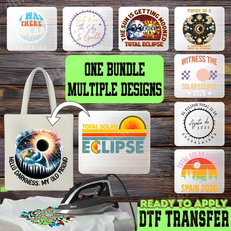 See allThis exclusive DTF transfer bundle celebrates the awe-inspiring Total Solar Eclipse, featuring a diverse collection of ready to press designs. From illustrative celestial alignments to witty phrases like "The Sun Is Getting Mooned" and "Hello Darkness. My Old Friend," these graphics capture the excitement of this rare phenomenon. Each heat press ready design offers a distinct style, perfect for commemorating upcoming eclipses, including those in 2026. These versatile heat transfer designs are ideal for astronomy enthusiasts, sky gazers, and anyone planning to witness the 2026 total solar eclipses in locations like Guadalajara, Mexico, and Spain. They make fantastic gifts, perfect for creating matching shirts for viewing parties, school events, or simply expressing your love for cosmic occurrences. Commemorate this "twice in a lifetime" event with unique apparel that truly stands out. Our premium direct to film transfers are incredibly easy to apply on cotton, polyester, and blends. For best results, use a heat press at 300-325°F for 15 seconds with medium pressure, followed by a cold peel. A household iron can also be used carefully. Enjoy hassle-free customization – these iron on decals require no weeding, saving you time for your custom apparel projects. Experience superior quality with our professional-grade DTF transfers. Each shirt design boasts vibrant, true-to-color prints that are highly durable, crack-resistant, and incredibly soft to the touch. Printed on high-quality DTF film with strong, flexible adhesive, these apparel transfers ensure a long-lasting finish on your garments, elevating your custom t-shirts and accessories.