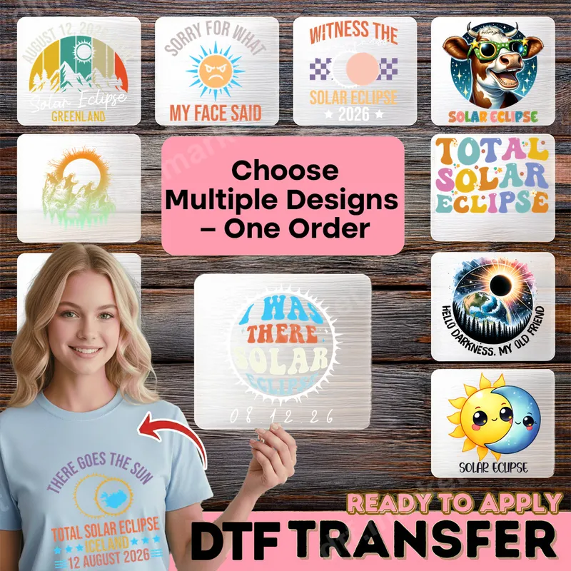 See allThis vibrant collection of DTF transfers celebrates the magic of solar eclipses with a mix of humor, retro vibes, and commemorative designs. Featuring everything from sarcastic suns to cute cartoon moons and iconic phrases like "Hello Darkness, My Old Friend," each high-quality direct to film transfer is ready to press onto your favorite apparel. These unique designs are perfect for capturing the excitement of upcoming eclipses in 2026 and beyond, making it easy to create custom t-shirts or other garments without the hassle. These heat press designs are ideal for eclipse chasers, astronomy enthusiasts, and anyone who loves a good celestial event with a touch of wit. Whether you're attending a viewing party, planning a family trip to a prime viewing location, or simply want a memorable keepsake, these ready to press transfers offer a fun way to express your enthusiasm. They also make fantastic gifts for friends and family who witnessed or plan to witness these rare cosmic spectacles. Applying your new iron on transfer is simple. Our DTF transfers work beautifully on a wide variety of materials, including cotton, polyester, and cotton/poly blends. Just use a heat press at 300-325°F for 15 seconds with medium pressure, then give a cold peel. For those without a heat press, a household iron can also be used with care. There's no weeding required, making the application process quick and mess-free, even for beginners creating their first custom transfer. Each of our apparel transfers is produced using professional-grade DTF film and inks, ensuring exceptional vibrancy and durability. The designs are crack-resistant, peel-resistant, and feel soft to the touch once applied, integrating seamlessly with your garment. Enjoy long-lasting colors and intricate details that stand up to repeated washes, allowing you to proudly wear your eclipse memory for years to come.