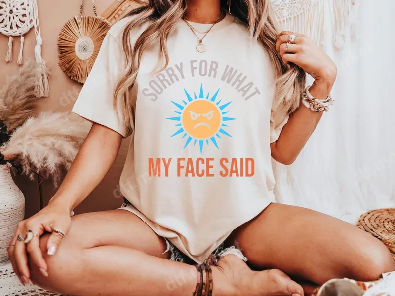 See allThis vibrant DTF transfer features the hilarious phrase "SORRY FOR WHAT MY FACE SAID" alongside an expressive, angry sun icon. It's the perfect ready to press design for anyone who struggles with their facial expressions betraying their true feelings. The playful yet sarcastic vibe makes it an instant conversation starter and a unique addition to any wardrobe. This humorous heat transfer is ideal for friends, family, or colleagues who appreciate witty remarks and a touch of sass. It makes a fantastic gift for birthdays, white elephant exchanges, or just a fun surprise for a grumpy friend. Perfect for casual wear, social gatherings, or simply making a statement without saying a word, this heat press design captures everyday relatable moments. Applying this high-quality iron on transfer is effortless, suitable for a wide range of materials including cotton, polyester, and blends. Achieve professional results using a heat press set to 300-325°F for 15 seconds with medium pressure, or apply with a household iron. There's no tedious weeding required, making custom apparel a breeze with this t-shirt transfer. Our DTF transfers are renowned for their exceptional quality, delivering brilliant colors that pop and a soft, smooth feel on any garment. Engineered to be crack-resistant and highly durable, your apparel transfer will withstand numerous washes, maintaining its vibrant appeal. Trust dtf.market for professional-grade film and strong adhesive, ensuring a flawless application every time.