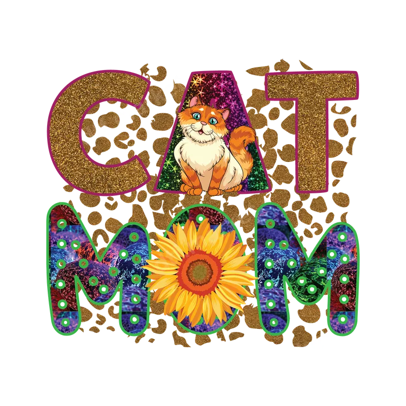 Sparkling Cat Mom DTF Transfer with Sunflower & Leopard Print
