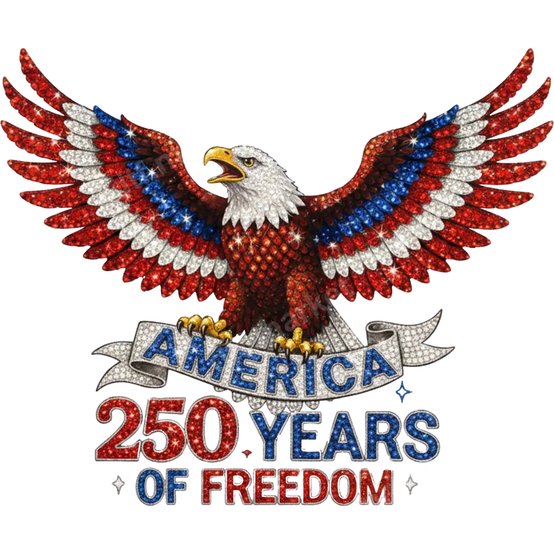 See allShowcase your American pride with this stunning DTF transfer featuring a majestic bald eagle. This dazzling design, adorned with a sparkling, rhinestone-like texture, depicts the eagle with wings in vibrant red, white, and blue, reminiscent of the American flag. Below the powerful eagle, a banner proclaims "AMERICA" followed by "250 YEARS OF FREEDOM" in matching glittery red and blue text. This high-quality transfer is ready to press, ensuring a brilliant and impactful statement for any patriotic occasion. This eye-catching design is perfect for patriots, veterans, history enthusiasts, and anyone celebrating American heritage. Ideal for gifting or creating custom apparel for the 4th of July, Memorial Day, Veterans Day, or the upcoming 250th anniversary of American independence, this transfer lets you wear your pride with style. It's an excellent choice for family reunions, commemorative events, or simply expressing your love for the USA year-round. Applying this heat transfer is straightforward. It works seamlessly on a wide range of materials, including cotton, polyester, and various fabric blends. For best results, use a heat press at 300-325°F for 15 seconds with medium pressure, then cold peel. A household iron can also be used with careful application. Best of all, this iron on transfer requires absolutely no weeding, saving you time and effort to create professional-looking apparel. Crafted from durable, professional-grade DTF film, this ready to press transfer boasts exceptional color vibrancy and a soft, comfortable feel. The strong adhesive ensures a long-lasting, crack-resistant design that stands up to countless washes, maintaining its dazzling appearance. Elevate your wardrobe with this premium t-shirt transfer, perfect for creating unique garments that truly shine.