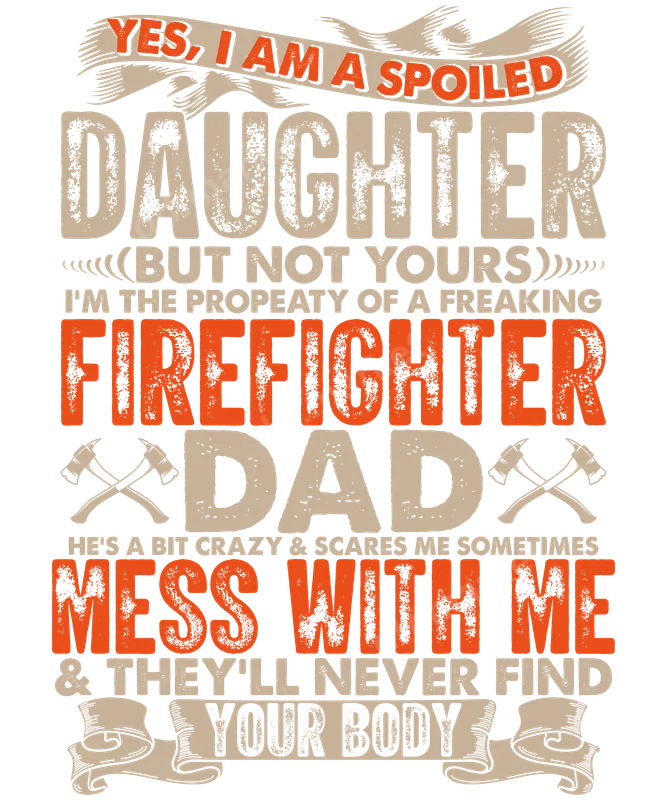 See allThis bold and humorous DTF transfer proudly declares, "YES, I AM A SPOILED DAUGHTER (BUT NOT YOURS) I'M THE PROPERTY OF A FREAKING FIREFIGHTER DAD HE'S A BIT CRAZY & SCARES ME SOMETIMES MESS WITH ME & THEY'LL NEVER FIND YOUR BODY." Featuring a distressed, grungy font in vibrant orange and warm beige tones, with crossed axes graphics, it's a perfect ready to press design for any proud daughter who loves her brave, protective dad and isn't afraid to show it. This fierce design is tailor-made for daughters of firefighters, expressing love, humor, and a touch of warning to others. It's an ideal heat press transfer for celebrating Father's Day, birthdays, or simply showing off your family pride on any given day. Perfect for gifts, whether it's for a daughter who adores her heroic dad or for a family member looking to support their firefighter's unique bond. Applying this high-quality iron on transfer is a breeze, whether you use a professional heat press or a household iron. Our direct to film transfers adhere beautifully to a wide range of materials, including cotton, polyester, and various blends, making them versatile for almost any garment. With no weeding required, you can effortlessly transform a plain shirt into a custom shirt design in minutes. For best results, use a heat press at 300-325°F for 15 seconds with medium pressure. Experience superior quality with every apparel transfer. Our DTF prints boast vibrant colors, exceptional durability, and a soft, flexible feel that resists cracking and peeling, even after multiple washes. Produced on professional-grade DTF film with a strong, reliable adhesive, your design will look fantastic and last for years. Enjoy professional-grade results that make your custom creations stand out.