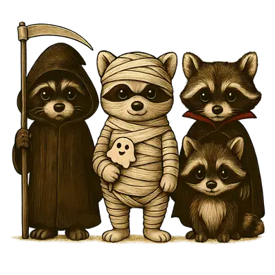 Spooky Cute Raccoon Halloween Crew DTF Transfer | Grim Reaper, Mummy, Vampire