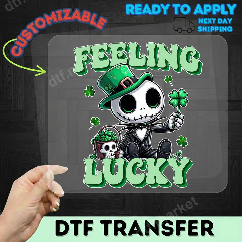 See allThis vibrant DTF transfer features a charmingly spooky skeletal character, reminiscent of Jack Skellington, fully embracing the St. Patrick's Day spirit. Dressed in a festive green top hat and holding a lucky four-leaf clover, our friendly skeleton sits beside a skull-shaped pot overflowing with more clovers. The playful text "FEELING LUCKY" in a bold, green font perfectly captures the whimsical mood. This ready to press design brings a unique, fun twist to your holiday apparel, blending spooky charm with Irish cheer. Perfect for anyone who loves a blend of pop culture and holiday fun, this heat press transfer is ideal for St. Patrick's Day celebrations, themed parties, or as a quirky everyday statement. It's a fantastic gift for fans of gothic aesthetics, Halloween enthusiasts, or anyone with a sense of humor looking to add a unique touch to their wardrobe. Create custom t-shirts, hoodies, or tote bags for friends, family, or yourself to stand out this March. Applying this direct to film transfer is effortless, making it suitable for both professional crafters and DIY enthusiasts. It adheres beautifully to a wide range of fabrics including cotton, polyester, and their blends. For best results, use a heat press at 300-325°F for 15 seconds with medium pressure. Alternatively, a household iron can be used with care for smaller applications. Enjoy a seamless application process with no weeding or complicated steps required – just press and go! Experience premium quality with our durable and vibrant apparel transfer. Each design is printed using high-grade inks on professional DTF film, ensuring colors remain bright and crisp wash after wash. The transfers are crack-resistant and offer a soft, smooth feel on your garment, unlike bulky vinyl transfers. Our strong adhesive guarantees long-lasting results, making your custom creations look professionally made and ready for everyday wear.