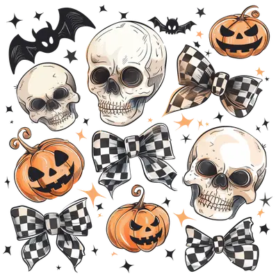Spooky Skulls & Jack-o'-Lanterns DTF Transfer with Checkered Bows & Bats