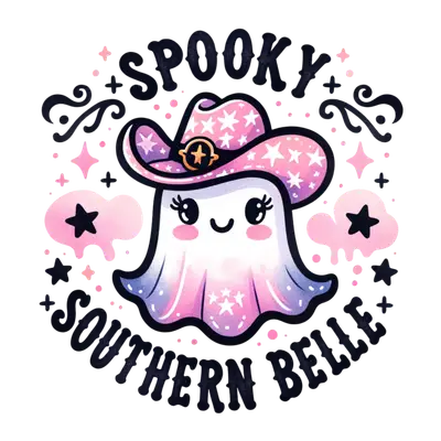See allThis charming Spooky Southern Belle Ghost DTF transfer features an adorable, blush-cheeked ghost wearing a stylish pink cowboy hat adorned with white stars and a gold badge. The design, encircled by the whimsical "Spooky Southern Belle" text, showcases a delightful blend of pastel pink, purple, and black with subtle starry accents, creating a cute yet festive Halloween vibe. This vibrant, ready to press design is perfect for adding a touch of playful southern charm to any garment or accessory. Unleash your inner Southern spirit with this unique iron on transfer! It's perfect for young women, teens, crafters, and small business owners creating custom apparel for fall festivals, Halloween parties, or country-themed events. Whether you're a fan of cute ghosts, western flair, or simply love unique graphic tees, this heat transfer design makes an excellent gift or a personal statement piece that stands out. Our versatile heat press transfer works seamlessly on a wide range of fabrics including cotton, polyester, cotton-poly blends, and even nylon, ensuring broad application possibilities. Easily apply with a heat press set to 300-325°F for 15 seconds with medium pressure, or use a household iron for smaller projects. No weeding required – simply peel and press! Create custom t-shirts, cozy hoodies, trendy denim jackets, durable tote bags, or even cute baby onesies. For lasting durability, wash garments inside out and tumble dry on low heat. Experience premium quality with this ready to press transfer, featuring vibrant, full-color printing and exceptional fine detail that truly pops. The design is crack-resistant and boasts a soft-to-the-touch feel, eliminating the heavy, stiff texture often associated with vinyl. Each direct to film transfer is meticulously printed on high-grade DTF film with a strong adhesive backing, ensuring professional, long-lasting results for all your custom apparel needs.