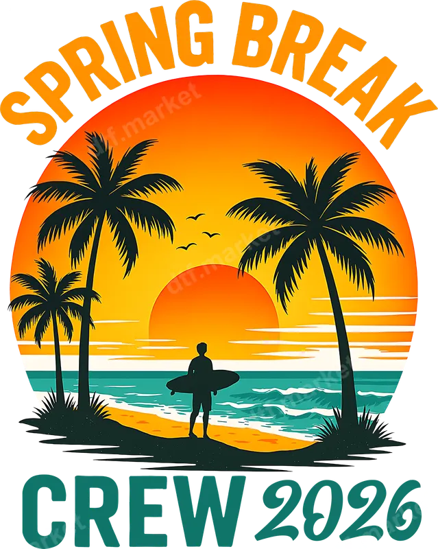 See allEmbrace the ultimate vacation vibe with this vibrant DTF transfer featuring a serene tropical beach scene. The design showcases a lone surfer silhouetted against a breathtaking sunset, framed by swaying palm trees, with the bold text "SPRING BREAK" arcing above and "CREW 2026" below. This ready to press design perfectly captures the essence of a memorable beach getaway, making it ideal for creating personalized apparel for your upcoming adventures. This unique design is perfect for college students, high school groups, and friends planning their epic Spring Break 2026 trip. It's an ideal apparel transfer for creating matching t-shirts, hoodies, or tank tops for your entire crew, ensuring you stand out on the beach or at any party. Commemorate your special vacation year or gift it to fellow travel enthusiasts ready for some fun in the sun. Applying this transfer is a breeze, whether you're using a professional heat press or a household iron. It adheres beautifully to a wide range of fabrics, including 100% cotton, polyester, and cotton-poly blends. Simply press at 300-325°F for 15 seconds with medium pressure. There's no tedious weeding required, making this an easy to use iron on transfer for crafting personalized garments quickly and efficiently. Our professional heat transfer ensures exceptional quality. Expect vibrant colors that pop, superior stretch, and excellent crack resistance, ensuring your design looks great wash after wash. The soft-touch feel of our premium DTF film and strong adhesive guarantee a durable and comfortable finish, transforming any garment into a custom piece of beach-ready apparel.