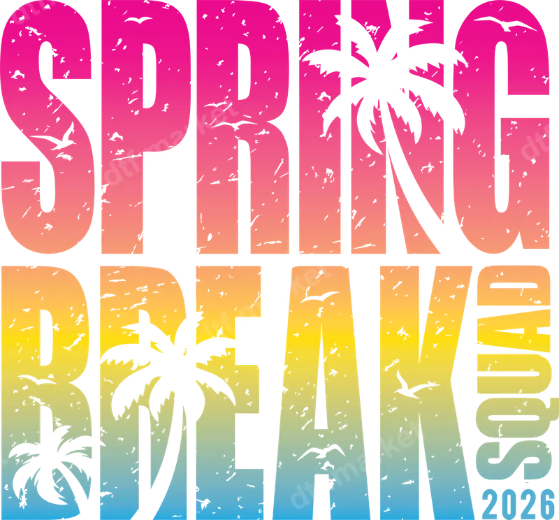 See allGet ready to celebrate Spring Break 2026 with this vibrant DTF transfer! The design features "SPRING BREAK SQUAD 2026" in bold, distressed lettering, showcasing a stunning gradient from hot pink to orange, yellow, and cool blue. Silhouettes of tropical palm trees and soaring birds create a perfect beach vacation vibe. This ready to press transfer is ideal for adding a lively, festive touch to any garment, making your group stand out. This tropical heat transfer is specifically designed for anyone planning an epic Spring Break trip in 2026. Perfect for student groups, friend getaways, or family vacations heading to sunny destinations. It makes an excellent matching shirt design for your entire squad, ensuring everyone looks unified and ready for fun. Use it to create memorable apparel for beach parties, resort wear, or as a thoughtful gift for your travel companions before your adventure begins. Applying this professional-grade iron on transfer is incredibly simple. Our premium heat press transfer works seamlessly on cotton, polyester, and various blends. For best results, use a heat press at 300-325°F for 15 seconds with medium pressure, then cool peel. For those without a heat press, a household iron can also be used. There's no weeding required, saving time and effort! Experience superior quality with our DTF film transfers. Your finished t-shirt transfer will boast incredibly vibrant colors that pop, ensuring your design is noticed. It's engineered to be highly durable, crack-resistant, and pill-resistant, maintaining its fresh look wash after wash. The finished design has a soft, flexible feel on the garment, unlike bulky vinyl. Each direct to film transfer uses strong adhesive for a lasting bond, creating professional-grade apparel right at home or in your shop.