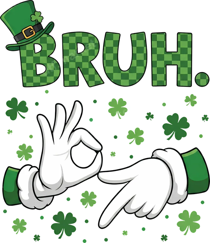 See allThis vibrant DTF transfer features a playful "BRUH." text in a festive green checkered pattern, complete with a charming leprechaun hat. Below, a pair of iconic cartoon hands recreate a popular internet meme gesture, surrounded by scattered shamrocks, making it a perfectly ready to press design for St. Patrick's Day. It’s a humorous and eye-catching graphic that’s sure to get laughs. Perfect for anyone with a sense of humor looking to celebrate St. Patrick's Day with a modern twist. This heat press transfer is ideal for friends, meme lovers, college students, or anyone attending a festive parade or party. It makes a fantastic gift for St. Paddy's celebrations, adding a touch of funny sarcasm to any outfit. Applying this high-quality iron on transfer is a breeze! Our designs work seamlessly with cotton, polyester, and most fabric blends. For best results, use a heat press at 300-325°F for 15 seconds with medium pressure, then cold peel the film. No weeding, cutting, or layering is required, making your customization process quick and effortless. You can even use a household iron for smaller projects. Each apparel transfer is crafted from professional DTF film, ensuring vivid colors and crisp details that truly pop. Enjoy a crack-resistant, soft-to-the-touch finish that feels like part of the fabric, not a bulky decal. With strong adhesive properties, your new shirt design will withstand countless washes, keeping your St. Patrick's Day humor looking fresh year after year.
