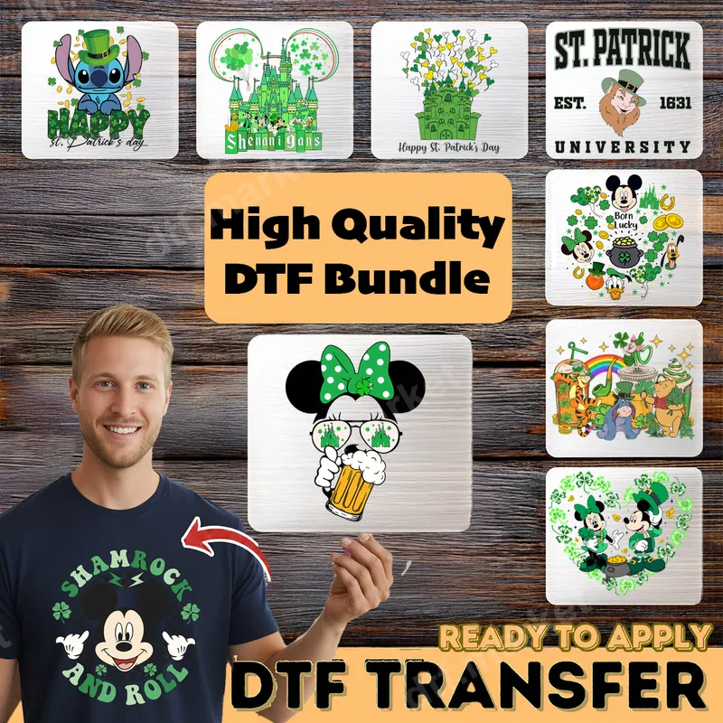 See allCelebrate St. Patrick's Day with our vibrant Cartoon Character DTF Transfer Bundle! This collection features an array of festive and beloved characters, adorned with shamrocks, leprechaun hats, and other lucky symbols. Each design is a high-quality DTF transfer, meticulously crafted to bring fun and cheer to your apparel. Find popular characters like Mickey, Minnie, and Stitch reimagined for the holiday, all ready to press. This delightful bundle is perfect for creating unique St. Patrick's Day outfits for family celebrations, parades, parties, or festive everyday wear. Crafters, small businesses, and DIY enthusiasts will appreciate the variety and ease of use. These designs make fantastic personalized gifts, ensuring everyone can show off their Irish spirit with a touch of nostalgia and humor. Applying these direct to film transfers is incredibly simple, making customization accessible. Our heat press transfers work beautifully on a wide range of fabrics, including cotton, polyester, and blends. For best results, use a heat press at 300-325°F for 15 seconds with medium pressure. They can also be applied with a household iron with firm, even pressure. No tedious weeding or layering is required. Experience the professional quality of our DTF transfers. Each image boasts vibrant colors, excellent detail, and a soft-to-the-touch finish that resists cracking and peeling, even after multiple washes. Made with premium DTF film and a strong adhesive, these heat press designs ensure long-lasting wear and a professional look on any garment or accessory. Transform your blanks into holiday masterpieces with these durable iron on transfers.