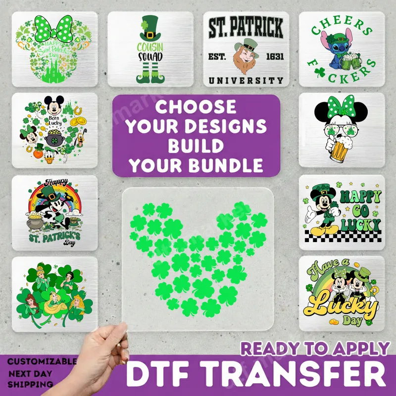See allGet ready to celebrate the luck of the Irish with our festive St. Patrick's Day DTF transfers! This vibrant collection features a delightful array of designs, from charming clovers and playful leprechauns to beloved cartoon characters like Mickey, Minnie, Stitch, and Disney Princesses, all decked out in green. Each design captures the spirit of the holiday with rainbows, pots of gold, and witty Irish phrases. These high-quality direct to film transfers are professionally printed and come ready to press, making your custom apparel projects a breeze. Perfect for anyone looking to add a touch of St. Patrick's Day magic to their wardrobe or merchandise, this collection is ideal for holiday parties, parades, family gatherings, or just showing off your Irish pride. Crafters, small businesses, and individuals alike will find endless possibilities to create unique t-shirts, hoodies, or accessories. These heat press designs also make fantastic, personalized gifts for friends and family celebrating the holiday. Applying these versatile heat transfers is incredibly simple, suitable for a wide range of materials including cotton, polyester, and various fabric blends. For best results, use a heat press at 300-325°F for 15 seconds with medium pressure. Even a household iron can be used by applying firm, even pressure. Say goodbye to tedious weeding – our ready to press transfers mean you get a flawless design with minimal effort, transforming any garment into a festive statement piece. Each iron on transfer boasts exceptional durability and vivid color, ensuring your designs stand out and last through countless wears and washes. Our professional-grade DTF film provides a soft, flexible feel that won't crack or peel, combined with strong adhesive properties for a secure application. Experience premium quality apparel transfers that bring your creative visions to life with professional results every time.