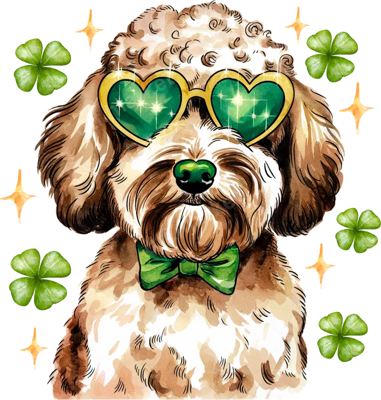 See allThis delightful DTF transfer features an adorable brown doodle dog, sporting shimmering green heart-shaped sunglasses and a matching green bow tie, all rendered in a charming watercolor style. The festive design is playfully accented with vibrant four-leaf clovers and sparkling starbursts, creating a whimsical and lucky vibe. This high-quality, ready to press transfer is perfect for adding a touch of Irish cheer to your wardrobe or accessories. Ideal for dog lovers, doodle owners, and anyone celebrating St. Patrick's Day, this heat press transfer makes a fantastic statement. It's perfect for creating festive outfits for parades, parties, or just showing off your Irish spirit and love for dogs. This design also makes a unique and thoughtful gift for dog moms, pet owners, or crafters looking for a fun St. Patrick's Day project. Our heat press designs are incredibly versatile and simple to apply to a wide range of garments. This iron on transfer adheres beautifully to cotton, polyester, and most fabric blends. Simply use a heat press at 300-325°F for 15 seconds with medium pressure, or apply with a household iron following our detailed instructions. Best of all, there's no tedious weeding required, making your crafting experience effortless. Experience the professional difference with our DTF transfers. Each custom transfer boasts vibrant colors that pop, exceptional durability, and a soft, lightweight feel that won't crack or peel. Made with premium DTF film and strong adhesive, this apparel transfer ensures a long-lasting, high-quality finish on all your personalized items, offering a superior alternative to traditional vinyl transfer options.