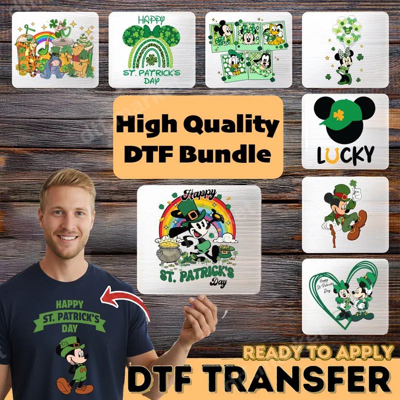 See allCelebrate St. Patrick's Day in style with this vibrant DTF transfer bundle! Featuring a collection of festive designs, including whimsical leprechauns, lucky shamrocks, cheerful rainbows, and pots of gold, these heat press ready transfers capture the spirit of the holiday. Each design in this bundle offers a fun, cartoonish aesthetic, perfect for creating unique apparel and accessories. This versatile bundle is ideal for anyone looking to add a touch of Irish charm to their wardrobe or craft projects. Perfect for St. Patrick's Day parties, parades, school events, or as a thoughtful gift for friends and family. Crafters, small business owners creating holiday merchandise, and parents making festive outfits for their kids will find these designs perfect. Applying these premium DTF (Direct-to-Film) transfers is quick and easy. Designed for a professional finish, they work beautifully on various fabrics including cotton, polyester, and blends. Simply use a heat press at 300-325°F for 15 seconds with medium pressure, or apply with a household iron as an iron on transfer. No weeding, masking, or complex steps required – just press and peel for instant customization. These are truly ready to press transfers for hassle-free crafting. Experience exceptional quality with our high-definition apparel transfers. Each design boasts vibrant colors, crisp details, and a soft, flexible feel that resists cracking and peeling, even after multiple washes. Crafted from durable DTF film with strong adhesive, these shirt designs ensure long-lasting wear, making your custom creations stand out.