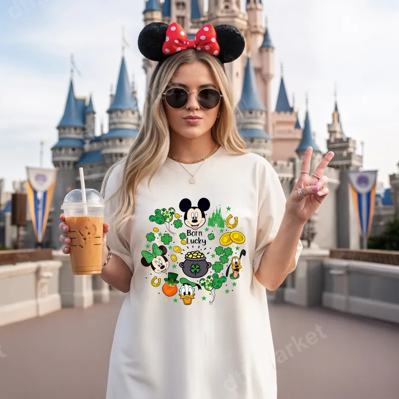 See allThis vibrant DTF transfer features beloved Mickey Mouse, Minnie Mouse, Donald Duck, and Pluto surrounded by classic St. Patrick's Day symbols like four-leaf clovers, shamrocks, gold coins, and a pot of gold. The playful "Born Lucky" text ties the entire design together, creating a cheerful and festive aesthetic perfect for celebrating the holiday. This high-quality direct to film transfer comes ready to press, making it easy to add a touch of Disney magic and Irish charm to any garment. Ideal for Disney fans, families, and anyone looking to celebrate St. Patrick's Day with a unique touch. This versatile heat transfer makes a fantastic personalized gift for friends and family, perfect for parade wear, themed parties, or a trip to a Disney park. Create custom apparel for school events, family gatherings, or just to show off your festive spirit. Our iron on transfers are incredibly easy to apply to a wide range of fabrics, including cotton, polyester, and cotton/poly blends. For best results, use a heat press at 300-325°F for 15 seconds with medium pressure, then peel cold. A household iron can also be used following similar guidelines. Enjoy a professional finish without the hassle of weeding, unlike traditional vinyl transfer methods. Experience superior quality with our premium DTF transfers. Each heat press design boasts incredibly vibrant colors that stand out, excellent durability, and resistance to cracking or peeling after washing. The finished design is soft to the touch, ensuring comfortable wear. We use professional-grade DTF film with a strong, reliable adhesive, guaranteeing a long-lasting, high-quality finish for all your custom apparel projects.