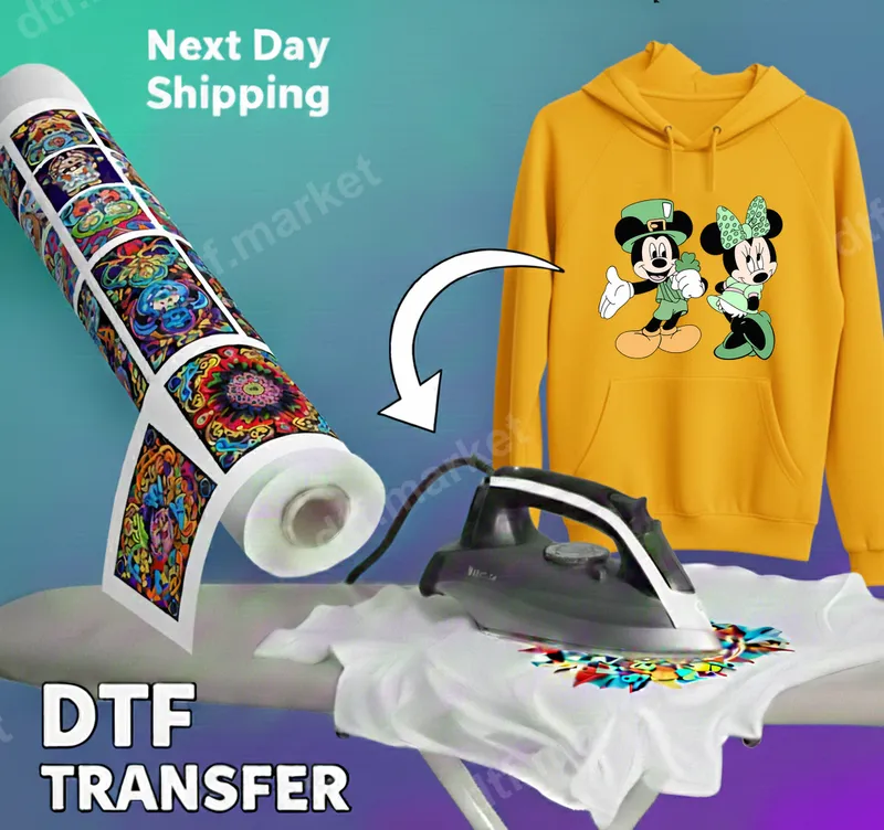 See allStep into the spirit of St. Patrick's Day with this charming Mickey & Minnie Mouse DTF transfer. Featuring everyone's favorite Disney duo dressed in festive green attire, complete with shamrocks and leprechaun hats, this design radiates cheerful holiday vibes. This vibrant direct to film transfer is pre-printed and ready to press onto your chosen garment, making custom apparel creation simple and fun for the holiday. This delightful heat press design is perfect for Disney enthusiasts, families, and anyone looking to add a touch of magic to their St. Patrick's Day celebrations. Ideal for crafting unique shirts for parades, holiday parties, or as a special gift, it’s a wonderful way to showcase your festive spirit. Create matching family outfits or personalized accessories that stand out. Applying this iron on transfer is incredibly straightforward, whether you're using a professional heat press or a household iron. Our high-quality apparel transfers adhere beautifully to cotton, polyester, and cotton-poly blend fabrics. For best results, press at 300-325°F for 15 seconds with medium pressure. Enjoy the convenience of a ready to press transfer with no tedious weeding required. Experience professional-grade quality with every DTF transfer. Our designs are known for their exceptionally vibrant colors, incredible durability, and crack-resistant finish. The result is a soft-to-the-touch graphic that feels integrated with the fabric. Each shirt design is printed on premium direct to film transfer film, ensuring strong adhesion and long-lasting wear for all your custom apparel.