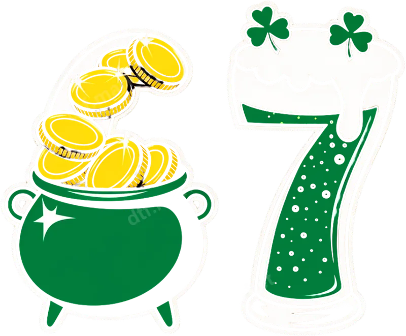 See allThis festive design captures the luck of the Irish with a classic pot of gold overflowing with shimmering coins and a bubbly glass of green beer topped with lucky shamrocks, cleverly shaped as the number seven. It's a vibrant and spirited DTF transfer, perfect for adding a touch of St. Patrick's Day cheer to any garment. Our heat press ready design ensures custom apparel can be created quickly and effortlessly. Ideal for anyone celebrating St. Patrick's Day, this design is perfect for parades, parties, bar crawls, or simply showcasing Irish spirit. It makes a fantastic gift for friends, family, or fellow revelers, allowing personalization of t-shirts, sweatshirts, and tote bags. Embrace the fun and festivities with this iconic Irish-themed apparel transfer, great for personal use or small business customization. Applying this ready to press transfer is simple and efficient, adhering beautifully to cotton, polyester, and fabric blends. For best results, use a heat press at 300-325°F for 15 seconds with medium pressure, then peel cold. A household iron can also be used with careful application. There's no weeding required, making your customization process smooth and hassle-free. Experience professional-grade quality with every iron on transfer. Our DTF film ensures vibrant, long-lasting colors that resist cracking and fading, even after multiple washes. The soft-touch finish provides a comfortable feel on any garment, while strong adhesive guarantees excellent durability. This shirt design delivers a high-quality, professional look for your custom apparel.