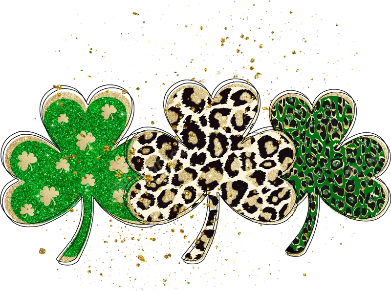 See allThis vibrant DTF transfer showcases a trio of stylish shamrocks, perfect for adding a touch of luck and fashion to your St. Patrick's Day celebrations. The design features a dazzling green glitter shamrock with smaller golden clovers, a classic leopard print shamrock with gold accents, and a unique green leopard print shamrock, all framed with a chic black outline and sparkling gold splatter. It's a ready to press transfer that brings modern flair to a traditional holiday symbol. Ideal for anyone looking to express their festive spirit with a trendy edge, this heat transfer is perfect for St. Patrick's Day parades, parties, or casual wear. It makes an excellent gift for friends, family, or even yourself. Create custom apparel for March festivities, whether you're celebrating Irish heritage or simply love the lucky charm. Applying this high-quality iron on transfer is a breeze. It works seamlessly on a wide range of fabrics, including cotton, polyester, and various blends, making it a versatile choice for your crafting projects. Simply use a heat press at 300-325°F for 15 seconds with medium pressure. For best results, allow the garment to cool completely before peeling the film. No weeding or complicated steps required – just press and enjoy your new custom shirt design! Our professional DTF film ensures a premium finish that is incredibly vibrant, resistant to cracking, and wonderfully soft to the touch. The strong adhesive guarantees your design will stay put, wash after wash. Elevate your wardrobe with this durable and eye-catching t-shirt transfer, designed to last and impress.