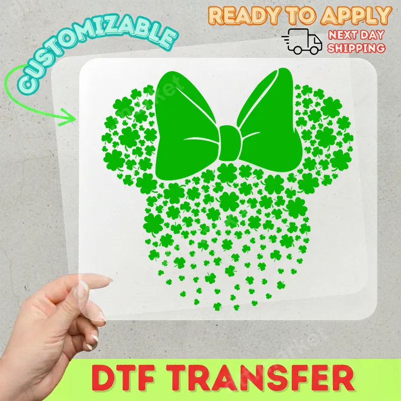 See allThe festive design features a charming Minnie Mouse head silhouette, creatively formed by an array of bright green shamrocks, complete with a distinctive large bow. This whimsical and lucky design is perfect for celebrating St. Patrick's Day with a touch of magic. It's a high-quality DTF transfer, meticulously crafted to be vibrant and durable, making it an ideal ready to press solution for your next apparel project. This enchanting shamrock Minnie Mouse transfer is perfect for Disney fans, families, teachers, and anyone looking to add a festive and playful touch to their St. Patrick's Day celebrations. Ideal for parades, school events, family gatherings, or simply showing your Irish spirit, this design makes a fantastic gift for friends or a charming personal treat. Create matching holiday outfits for a memorable celebration. Applying your new design is incredibly easy. This versatile heat transfer works beautifully on a wide range of fabrics including cotton, polyester, and various blends, ensuring a professional finish on almost any garment. For best results, use a heat press at 300-325°F for 15 seconds with medium pressure, followed by a cold peel. You can also achieve great results with a household iron. Best of all, there's absolutely no weeding required, saving you time and effort. Experience superior quality with every heat press transfer from dtf.market. Our direct to film transfers boast incredibly vibrant colors that stand out, excellent crack-resistant flexibility, and a remarkably soft-to-the-touch feel once applied. Each iron on decal is produced using professional-grade DTF film with a strong, reliable adhesive powder, ensuring your custom transfer adheres securely and lasts through countless washes. Elevate your apparel with our premium, long-lasting designs.