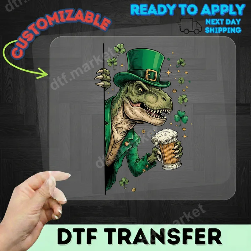 See allUnleash some prehistoric charm this St. Patrick's Day with our hilarious T-Rex Leprechaun DTF transfer. This vibrant design features a grinning Tyrannosaurus Rex sporting a classic green top hat and suit, complete with shamrock embellishments and a frothy pint of beer. It's a perfectly unique and festive direct to film transfer that's ready to press straight onto your favorite apparel, bringing a roar of laughter wherever you go. Get ready to celebrate with a prehistoric twist! This eye-catching heat press design is ideal for anyone looking to add a touch of humor and Irish spirit to their wardrobe. Perfect for St. Patrick's Day parties, parades, bar crawls, or simply making a statement year-round. It makes an excellent gift for dinosaur lovers, beer enthusiasts, or anyone who appreciates funny, unique apparel. Create custom t-shirts, sweatshirts, or tote bags for friends and family, ensuring they stand out in style. Applying your new iron on transfer is incredibly simple. Our premium ready to press transfer works beautifully on a wide range of fabrics, including cotton, polyester, and various blends. For best results, use a heat press at 300-325°F for 15 seconds with medium, even pressure. This professional-grade apparel transfer requires no weeding, trimming, or layering, making your DIY projects quick and effortless. Just peel and press for instant style. Experience superior quality with our DTF transfers. Each design boasts incredibly vibrant colors and sharp details that truly pop. Engineered to be crack-resistant and soft to the touch, your garments will maintain their comfort and integrity wash after wash. We use only professional DTF film with strong adhesive, ensuring your iron on decal provides a long-lasting, durable finish that rivals screen printing. Elevate your custom apparel game today!