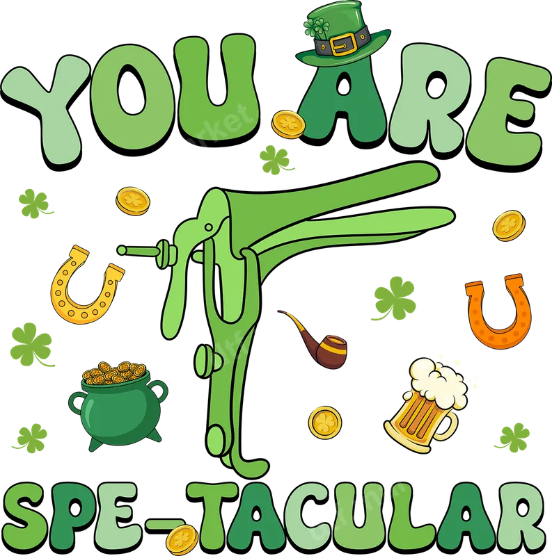 See allThis "You Are Spe-tacular" DTF transfer offers a uniquely hilarious take on St. Patrick's Day. Centered around a clever speculum pun, the design is adorned with classic Irish symbols like shamrocks, gold coins, a leprechaun hat, and a mug of beer, all rendered in vibrant greens. This ready to press transfer is perfect for those who appreciate bold, adult humor and want to stand out from the crowd with a truly unforgettable shirt design. Ideal for medical professionals, gynecologists, nurses, or anyone with a cheeky sense of humor, this design is perfect for St. Patrick's Day parties, pub crawls, or as a gag gift. It's a fantastic conversation starter that’s sure to get laughs. Use this heat transfer to create custom apparel for friends, family, or even your favorite medical colleague. Applying this direct to film transfer is effortless. It works flawlessly on a wide variety of materials including cotton, polyester, and their blends. Simply use a heat press at 300-325°F for 15 seconds with medium pressure, then cold peel. For smaller projects, a household iron can also achieve great results. No tedious weeding or layering is required, making your crafting quick and enjoyable. Crafted with professional-grade DTF film, this t-shirt transfer ensures stunning, crack-resistant results that are soft to the touch. The colors are incredibly vibrant, and the strong adhesive guarantees long-lasting durability, even after numerous washes. Elevate your wardrobe with a high-quality heat press design that expresses your unique personality.