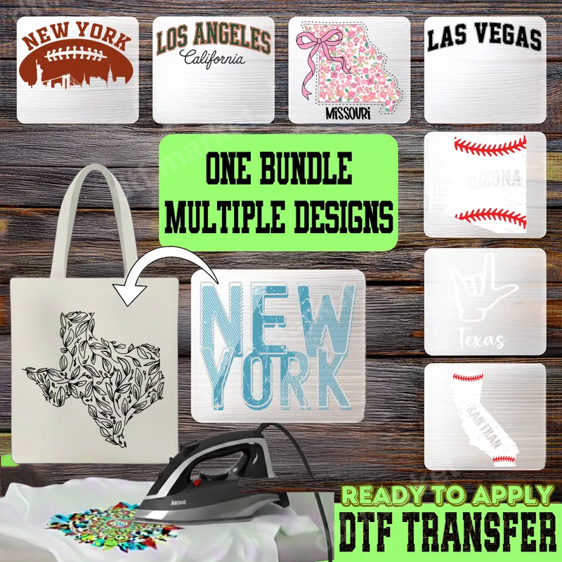 See allThis DTF transfer bundle features a diverse collection of state and city pride designs, perfect for showcasing your local spirit. Each ready to press transfer captures unique elements, from the iconic New York skyline infused with a football graphic and distressed typography, to a charming floral Missouri map with a pink bow, and a leafy Texas outline. You'll also find designs for Los Angeles, Las Vegas, Arizona (with baseball stitching), and a cool rock 'n' roll hand sign for Texas, offering a wide range of styles for any preference. This versatile bundle is ideal for crafters, small business owners, and anyone looking to create personalized apparel or accessories. Perfect for locals who love their city or state, as well as tourists wanting a souvenir. Use these designs for local sports events, school spirit wear, unique gifts for friends and family, or to add a touch of regional flair to your own wardrobe. It's a fantastic way to celebrate your hometown or favorite travel destination. Applying these heat transfers is straightforward, making them perfect for both beginners and experienced users. Our high-quality DTF transfers are designed to adhere seamlessly to a wide range of fabrics, including cotton, polyester, and various blends. For best results, use a heat press at 300-325°F for 15 seconds with medium pressure. These ready to press designs require no weeding, cutting, or layering, saving you time and effort compared to traditional vinyl transfer methods. Experience superior quality with every direct to film transfer in this bundle. Our designs boast vibrant colors, crisp details, and exceptional durability, ensuring they won't crack, peel, or fade after washing. The transfers are printed on professional-grade DTF film with a strong, flexible adhesive, resulting in a soft-to-touch finish that feels like part of the fabric. Elevate your custom t-shirt and apparel projects with these long-lasting, high-quality heat press designs.