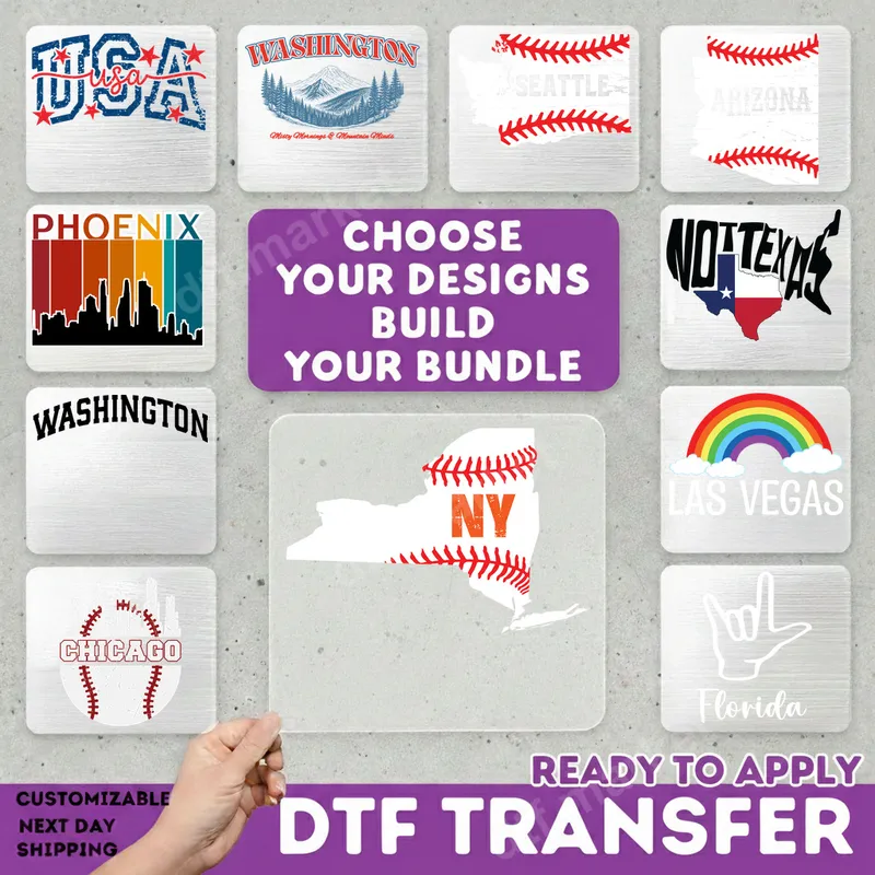 See allCelebrate your favorite places and passions with our vibrant collection of state, city, sports, and patriotic DTF transfers. From New York baseball laces to Washington mountains and Phoenix's retro skyline, these ready to press designs capture your chosen locale's spirit. Each direct to film transfer brings your apparel to life with stunning detail and color. These versatile heat transfers are perfect for locals, travelers, sports fans, or anyone who loves their home state or city. Ideal for personalizing t-shirts for family vacations, hoodies for local events, or unique gifts. Whether cheering on your team or commemorating a trip, these apparel transfers add a personal touch to any garment. Applying your new iron on transfer is simple. Our high-quality designs are compatible with cotton, polyester, and most fabric blends. Use a heat press at 300-325°F for 15 seconds with medium pressure, or a household iron. Forget weeding or layering vinyl transfer, these ready to press transfers offer a professional finish with minimal effort. Experience the superior quality of our DTF transfers. Each heat press design boasts vibrant, crack-resistant colors and exceptional durability, ensuring your customized apparel looks great wash after wash. The soft, flexible feel integrates seamlessly with fabric for comfortable wear. Trust our professional-grade DTF film with strong adhesive for long-lasting results.