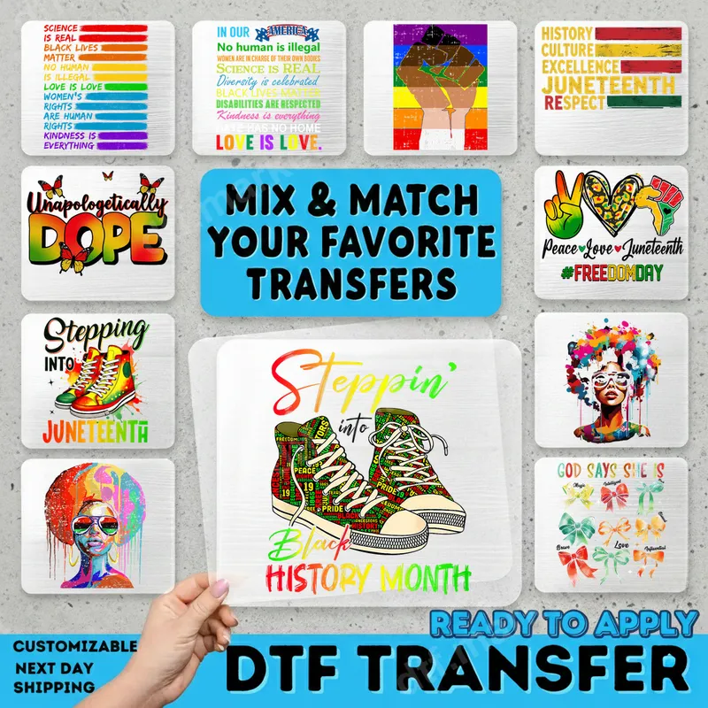 See allStep into Black History Month with pride and style using this vibrant DTF transfer. This striking design features a pair of classic high-top sneakers, intricately decorated with powerful words like "freedom," "equality," and "pride" in bold red, green, and yellow hues. The uplifting phrase "Steppin' into Black History Month" frames the energetic imagery, making it a perfect statement piece. This ready to press transfer brings a powerful message to life, celebrating heritage and progress in a visually engaging way. This meaningful design is ideal for anyone looking to honor and celebrate Black History Month, Juneteenth, or year-round cultural pride. It’s perfect for activists, educators, students, and community leaders who want to wear their values. Create unique gifts for friends and family, outfit your group for a special event, or simply express your personal commitment to justice and equality. This powerful heat transfer is more than just a design; it's a conversation starter. Applying this direct to film transfer is effortless and professional, suitable for a wide range of fabrics including cotton, polyester, and blends. Achieve a perfect finish using a standard heat press at 300-325°F for 15 seconds with medium pressure, or easily apply with a household iron. Unlike traditional vinyl transfers, there's no tedious weeding required. Simply press and peel for a flawless t-shirt transfer that’s ready to wear. Crafted using premium DTF film and professional-grade inks, this apparel transfer ensures exceptional quality. Expect incredibly vibrant colors that pop, a soft hand feel that seamlessly integrates with your fabric, and superior crack-resistant durability. Your custom transfer will maintain its brilliance and integrity wash after wash, making it a long-lasting addition to any wardrobe. Elevate your garments with a high-quality iron on decal that truly stands out.