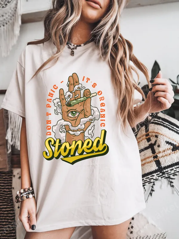 See allThis vibrant DTF transfer features a stylized hand holding a lit joint, complete with a bloodshot eye on the palm and swirling smoke. The playful text "DON'T PANIC - IT'S ORGANIC" encircles the top, while the bold word "Stoned" anchors the bottom in a classic, retro font. It's a humorous and laid-back design, perfect for expressing a chill vibe. This ready to press transfer is ideal for anyone looking to add a unique, conversation-starting graphic to their apparel. Designed for cannabis enthusiasts, those with a good sense of humor, or anyone who appreciates counter-culture graphics, this heat press design makes an excellent statement piece. It’s perfect for casual wear, music festivals, parties, or as a fun gift for friends on their birthday or for 4/20 celebrations. Show off your relaxed attitude and love for organic good times with this distinctive iron on decal. Applying this direct to film transfer is straightforward and hassle-free. It adheres beautifully to a wide range of fabrics, including cotton, polyester, and various blends, ensuring versatility for your projects. For best results, use a heat press at 300-325°F for 15 seconds with medium, even pressure. Unlike traditional vinyl, there's absolutely no weeding required, making your customization process quick and enjoyable. Experience exceptional quality with this professional-grade heat press ready design. Our DTF prints boast incredibly vibrant colors that pop, superior stretch and crack resistance for long-lasting wear, and a soft, lightweight feel that integrates seamlessly with the fabric. Each apparel transfer is printed on premium DTF film with a strong, durable adhesive, ensuring your design stays put and looks fantastic wash after wash.