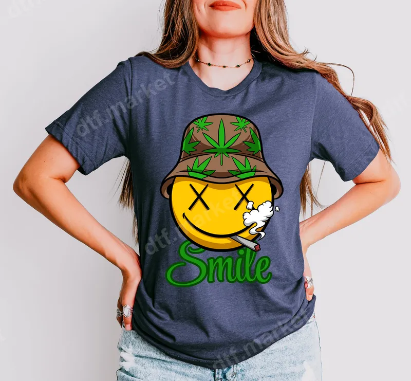 See allThis vibrant DTF transfer features a playful, "stoned" smiley face emoji rocking a stylish bucket hat adorned with bright green marijuana leaves. A lit joint, exhaling a puff of smoke, completes the chill vibe of this eye-catching design, accompanied by the script word "Smile" in a matching green. This ready to press transfer captures a relaxed, humorous, and counter-culture aesthetic perfect for personalizing your apparel. This unique heat transfer is ideal for cannabis enthusiasts, streetwear fans, or anyone who appreciates a laid-back, humorous statement piece. It makes an excellent gift for 4/20 celebrations, birthdays, or just to surprise a friend who enjoys unique, counter-culture designs. Customize t-shirts, hoodies, or tote bags for a personalized touch that stands out at festivals, casual outings, or just chilling with friends. Applying this heat press transfer is incredibly easy. Our high-quality iron on decal adheres flawlessly to a wide range of fabrics, including cotton, polyester, and various blends. For best results, use a heat press at 300-325°F for 15 seconds with medium pressure. It's also possible to apply with a household iron, making it accessible for everyone. Best of all, there's no tedious weeding required, saving you time and effort. Experience superior quality with our professional-grade direct to film transfers. This design boasts vibrant colors that pop and a soft-to-touch finish that feels great on any garment. Engineered to be crack-resistant and long-lasting, your custom shirt design will endure countless washes without fading or peeling. Each apparel transfer is made with premium DTF film and a strong adhesive, ensuring a durable and professional application every time.