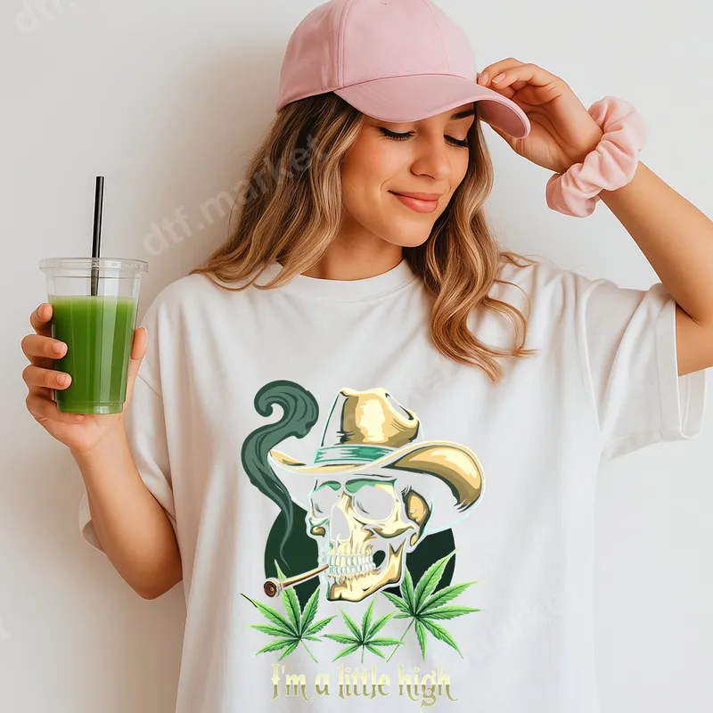 Stoner Cowboy Skull DTF Transfer - 'I'm A Little High' Ready To Press