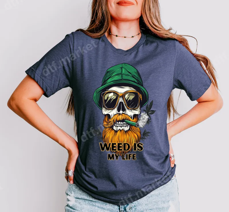 See allThis eye-catching DTF transfer features a unique skull design, sporting a cool green bucket hat and stylish sunglasses. A vibrant orange beard flows from its jaw, as a lit cigar puffs smoke, subtly surrounded by cannabis leaves. Below this distinctive character, the bold declaration "WEED IS MY LIFE" is proudly displayed. This ready to press design brings an edgy, humorous, and laid-back vibe, perfect for making a statement. Ideal for cannabis enthusiasts, stoner culture fans, and anyone with a relaxed sense of humor, this heat press transfer makes a fantastic conversation starter. It's perfect for casual gatherings, 4/20 celebrations, or as a fun, unique gift for friends. Apply this easy iron on transfer to personalize your wardrobe or create custom apparel for an event. Applying this apparel transfer is simple. Our high-quality direct to film transfer works beautifully on a wide range of fabrics, including cotton, polyester, and blends. For best results, use a heat press at 300-325°F for 15 seconds with medium pressure, then a cold peel. A household iron can also be used. Best of all, there's no weeding required, making your crafting quick and effortless. Experience professional-grade results with our premium DTF film. This heat press design offers incredibly vibrant colors, exceptional crack resistance, and a super soft touch once applied. Each custom transfer is crafted with strong adhesive properties, ensuring your design lasts wash after wash, maintaining its vividness and integrity.